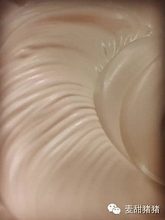 再加入1/3的绵白糖,改中速打发至打蛋器有明显的阻力、边打边顺时针转动缸盆时,打过的地方呈不会消失的波纹;