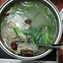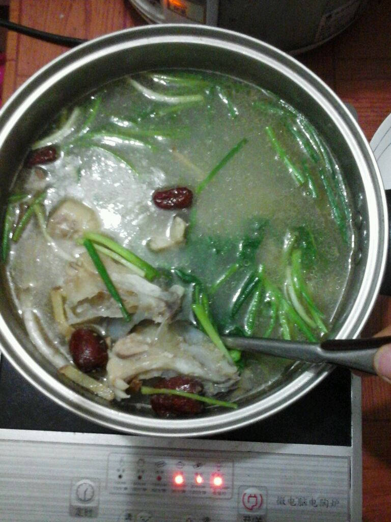 起锅下油把鱼头翻炒一下,煮出来的汤更白更好喝,家里有鸡精,我加了点鸡精提鲜,可加可不加