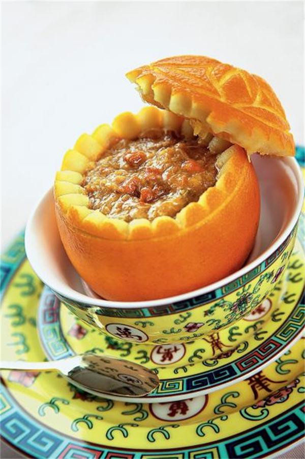 芋头蒸熟捣成泥,和蟹粉,姜汁混合在一起,填回到橙子里。
