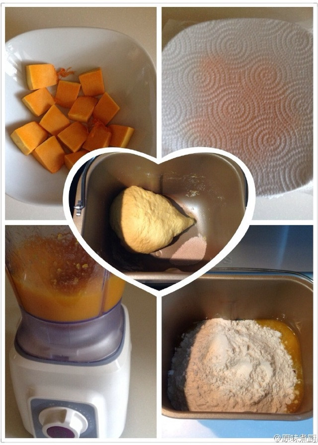 南瓜吐司 材料A 生南瓜(去皮去瓤)105克 水145-150克 材料B 面包粉300克 脱脂奶粉10克 糖25克 盐3克 材料C 酵母1+1/4小勺, 材料D 黄油15克; 材料E 葡萄干30克 核桃30克(掰小块) 南瓜洗净切皮去瓤,码放在瓷盘中,覆盖沾湿的厨房纸巾,微波炉高火3分钟(南瓜熟后重量85克),放入搅拌机,加水搅拌融合; 用面包桶称量面包粉,糖,盐,脱脂奶粉,南瓜汁215-220克,开启程序16揉面20分钟,程序结束后,长按“启动”键回到初始菜单,选择程序3和风面包,750克,烧色深,全程3:25,按时间+到4:00,把酵母放在远离面团的角落,待程序开始后,计时10分钟,放入黄油(如果没有时间守候,可以在加酵母以后,把黄油放在面团上方) 重要提示,选择预约功能,加料提示音不会响,需要自行留意加料时间;或在1:45搅拌桨排气10次后,选择暂停,取出面团手动擀卷加入馅料,拿掉搅拌桨,放回面团,再次按下暂停恢复程序,完成后立即取出待凉;
