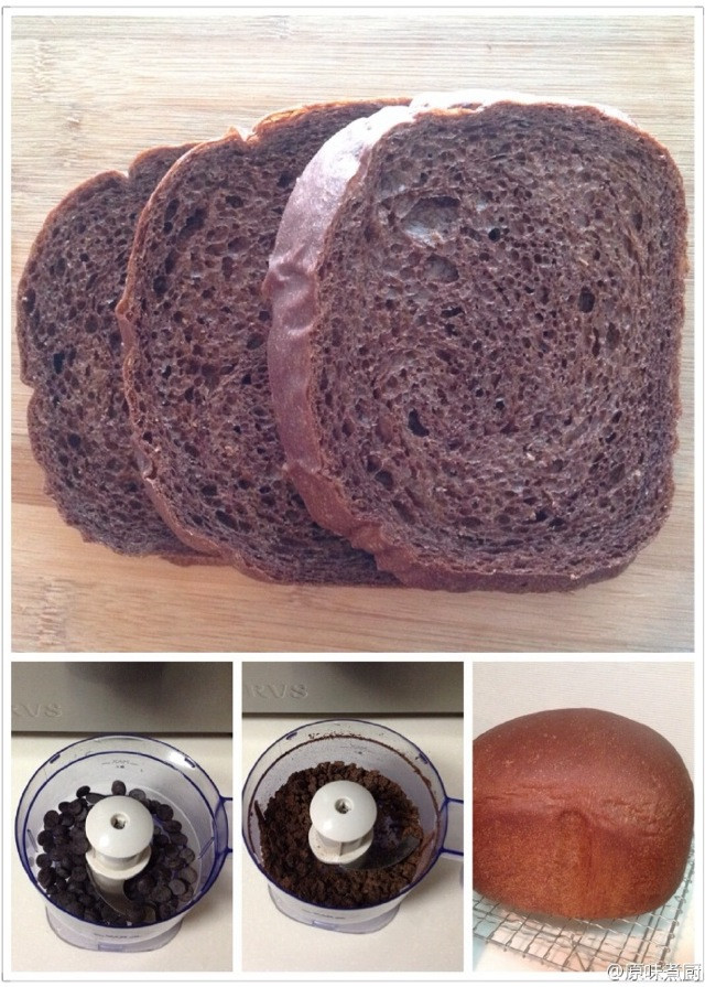 倍量巧克力吐司(500克 面包机型号9500) 材料A 面包粉225克 全麦面粉25克 细砂糖35克 盐1/2小匙 可可粉2大匙(20克) 水185克 材料B 耐糖酵母1小匙 材料C 黄油15克 材料D 巧克力50克(我用72%巧克力,搅拌机稍微打碎,也可以装入结实的食品袋,用擀面杖敲碎;喜欢颗粒感的可以不处理直接搅拌) 做法: 用面包桶称量材料A,启动程序16揉面13分钟,关闭电源,静置30分钟;撒酵母,启动程序3和风面包,重量500克,烧色深,15分钟后加入黄油;2:55加料提示音响起,计时5分钟加入巧克力碎,完成后立即取出散热; 可选程序: 1:45搅拌桨转动10次排气,按暂停,轻轻取出面团,拿掉搅拌桨,面团轻柔团圆,放回面包桶,再按暂停,恢复程序,完成后立即取出散热;