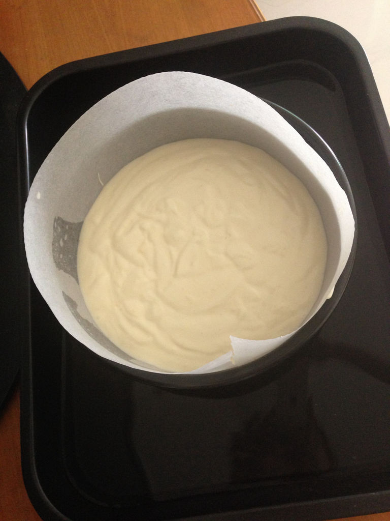 1、这个是7寸的方子,我用的是8寸固底模,因为怕进水,模具底部和四周都有铺上油纸,方便脱模