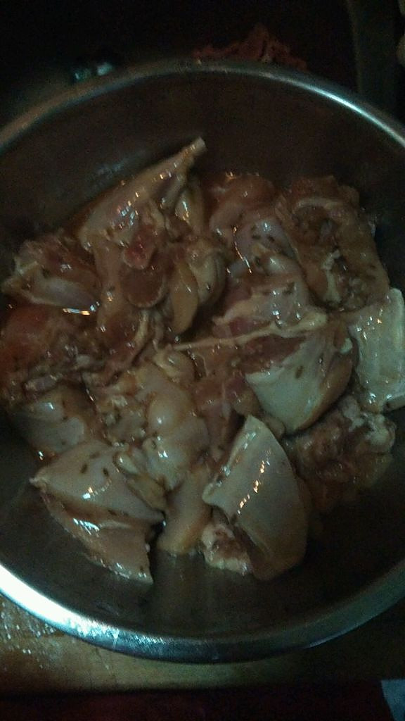 兔子肉可以先腌制下~放生抽,料酒,白胡椒,很多大的孜然粒。稍微放一点点老抽上色,放置一会。