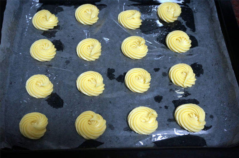 2、加了泡打粉的面糊,烤的时候体积会变大,所以挤饼干坯的时候要注意留空隙,饼干坯不适宜过大,一般挤出一圈至一圈半即可。