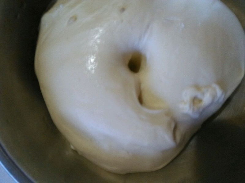 入烤箱,调到发酵档位开始二发,烤箱里坐一杯热水保持湿度,这是二发结束后,面团有明显增大,大概40多分钟