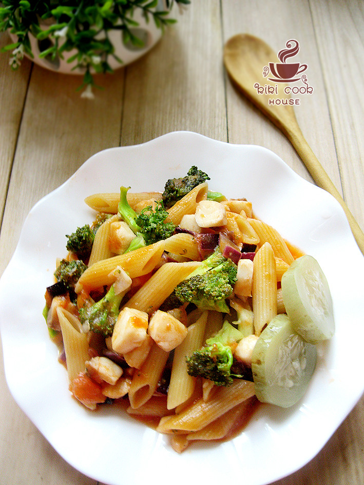 这道通心粉是用鲷鱼肉搭配蔬菜以酸甜开胃的茄汁为主味道来制作的。