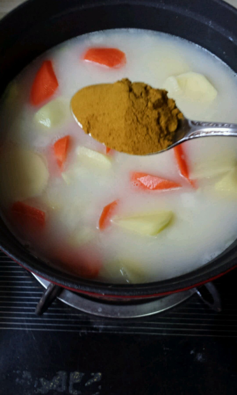 此菜谱大约三人的量,因为我家比较喜欢用咖喱汤泡米饭,所以水的量多点,反之就少加水,看各家喜好。如果你有多于200毫升的椰浆,相对水少点。