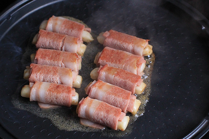 收到的时候已经傍晚,还是急着开箱试机了,最爱的培根和年糕,顺手做了道简单的菜,不会出错,但是焦香的培根裹着软糯Q弹的年糕,想想也醉了。