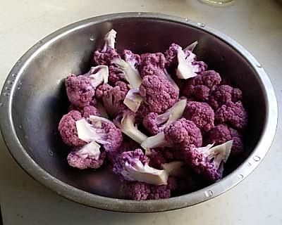 紫花菜是彩色花椰菜的一种,全名叫紫球花椰菜。其他还有黄色花椰菜、绿色花椰菜,宝塔形花椰菜,口感比白色花椰菜脆嫩,营养价值更为丰富。制作方法和彩色的花椰菜基本相同,