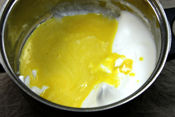 3、蛋黄糊倒入蛋白的时候我觉得不需要翻拌那么多,因为筛入面粉后要再翻拌一遍,翻拌多了很容易消泡,功亏一篑;