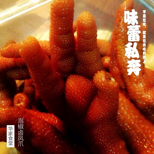 这款凤爪一改原本的净白外貌,披上了火红的长袍,看上去喜庆,碰触到舌间还会让你的味蕾起舞。这是我的自创配方秘制而成,绝对的独特,既继承了泡椒凤爪的鲜辣本色,又带有传统卤凤爪的风韵!