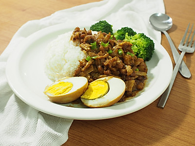 卤肉饭是台湾流行的一道猪肉饭菜肴,主要特点是以酱油卤过的肉末为主搭配米饭而食。从美食角度来讲,这必须是一道非常美味的菜肴,经过长时间的炖煮,猪肉肉质软绵、浓郁的酱香味又带着洋葱的清甜,和汤汁一起拌饭吃,那绝对是一绝,好吃的停不下来。但从营养角度来讲,原材料五花肉中脂肪含量较高(软五花即肥肉较多的五花肉每100g脂肪含量35.3g,硬五花即瘦肉较多的五花肉每100g脂肪含量30.6g),同时胆固醇的含量也较高(软五花为每100g含量98mg,硬五花为每100g含量77mg),并且制作时添加了冰糖,对于糖尿病患者、胆固醇过高者不宜多食。