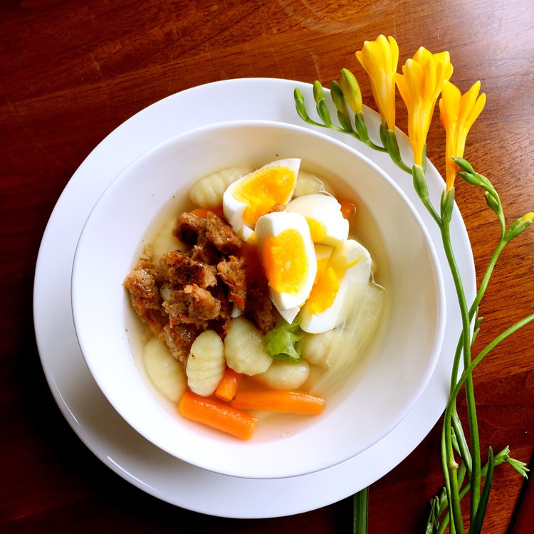 材料随意加,好吃好看就行!本人觉得有肉有菜有蛋还有汤就是上佳搭配呢!如果有现成的鸡汤就不必用鸡粉啦!土豆球包装上注明烹调时间为2分钟,实践证明刚好,煮太久土豆球会融化。家中常备速冻胡萝卜条和西生菜,煮面煮粉什么的很好配。