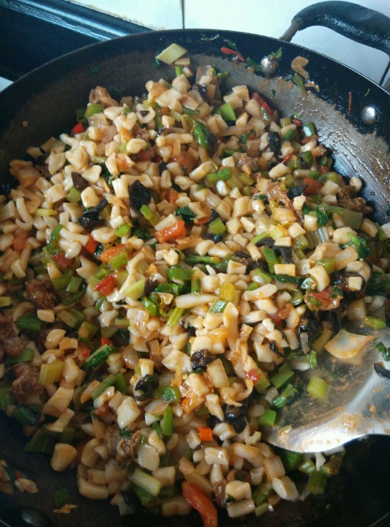 黑木耳是泡发后100克哦,做面丁丁时,面上多抹油才不会粘连。这道菜全程大火哦