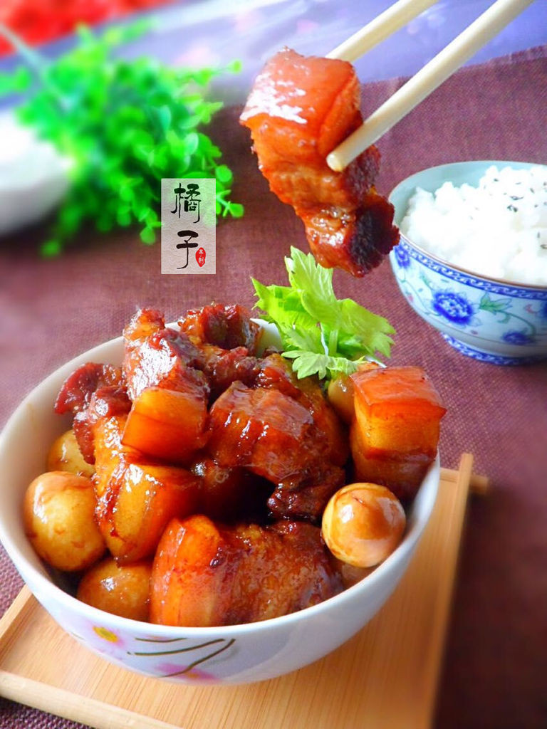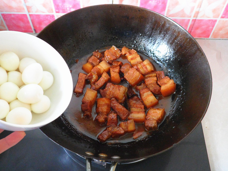 “浓油赤酱”的红烧肉,选用红白相间的五花肉来制作,色泽红亮诱人,肥而不腻,瘦肉筋道,今天我还往里添加了一些鹌鹑蛋,一枚枚鹌鹑蛋经过汤汁的炖煮之后,嚼之有劲、味醇香浓,十分美味。