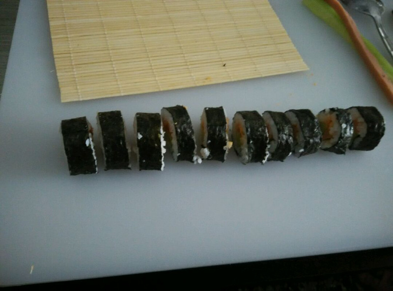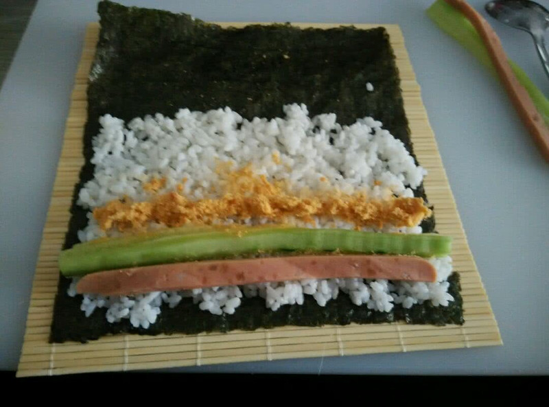 取三四勺米饭铺在紫菜上,稍压实一点让它占紫菜面积的三分之二,撒上肉松,黄瓜和火腿各取一条,用竹帘带着紫菜一端开始卷,卷完后在卷一遍稍微用力压实一点,之后切成小块。