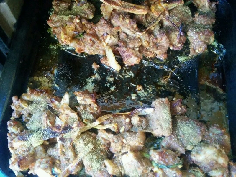 我下面放的是香菜,有这几个原因:1我们这边吃炖羊肉会放很多香菜,毕竟也是去腥提香的;2本人也比较喜欢这个味道;3昨天卖菜老板随手抓了一把香菜。建议大家可以放葱头,这个比较正规吧。下面尽量放这些东西,主要是不会糊底,也会比较香。电烤箱之简易烤羊肉的烹饪技巧