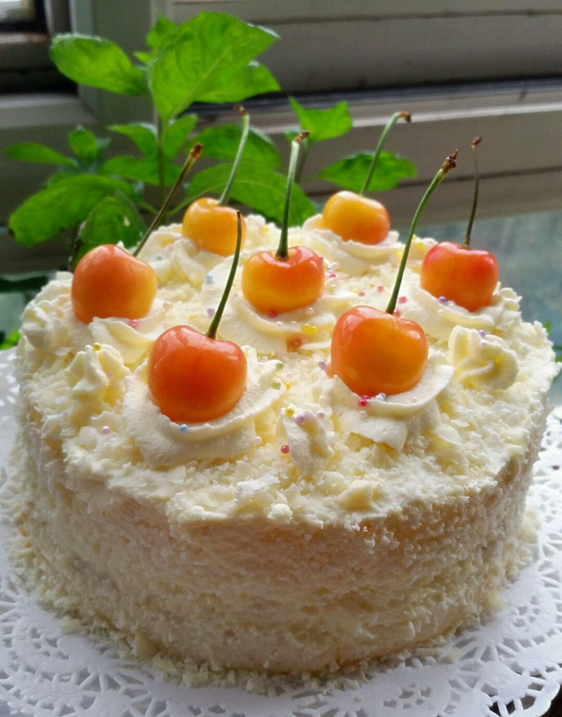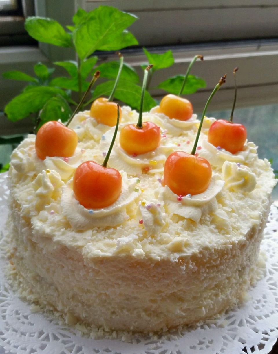 好朋友拿来了亲自采摘的樱桃,家里水果太多了,但好的东西是万万不可浪费的,把黄樱桃拿来配上白巧克力和淡奶油,做了个雪后的白色森林给娃做甜点,效果比上红樱桃配黑巧克力的黑森林,小清新了很多,似乎更适合夏天吃了。