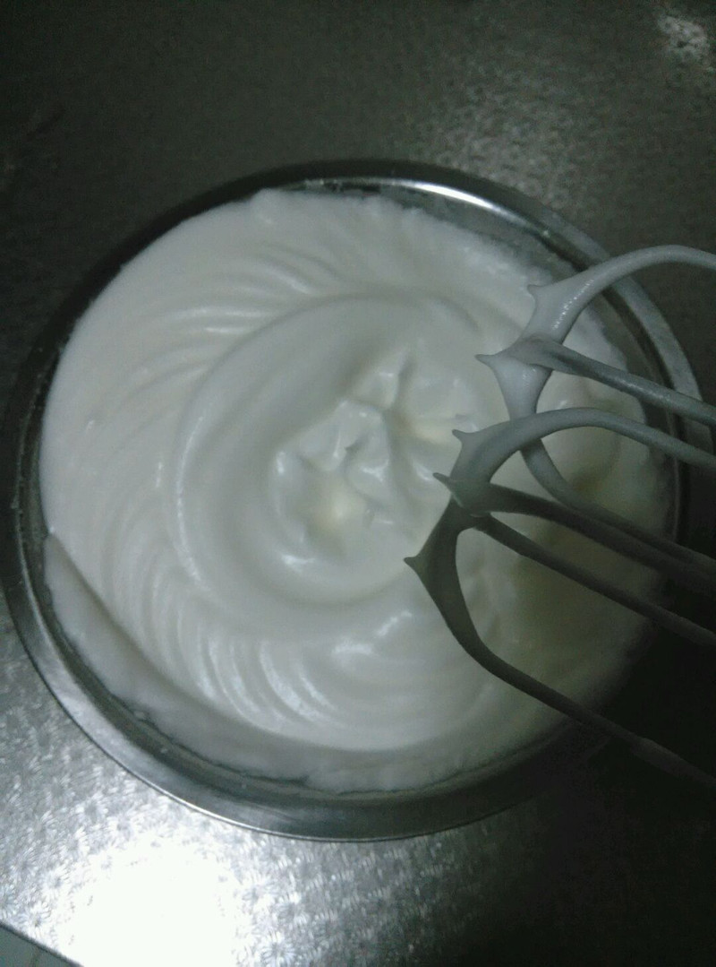 开始打蛋白了,放入几滴柠檬汁,我是买的瓶装,有的亲买新鲜柠檬。糖分三次加入,开始不放糖,搅打一会出现大的鱼眼泡加一部分糖,继续搅打到泡泡细腻加入一部分糖,慢慢的打蛋器感觉到有阻力,纹路清晰加入最后的糖,再继续搅打到干性发泡,直角出现。