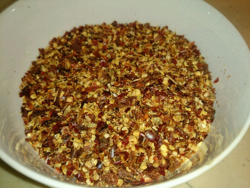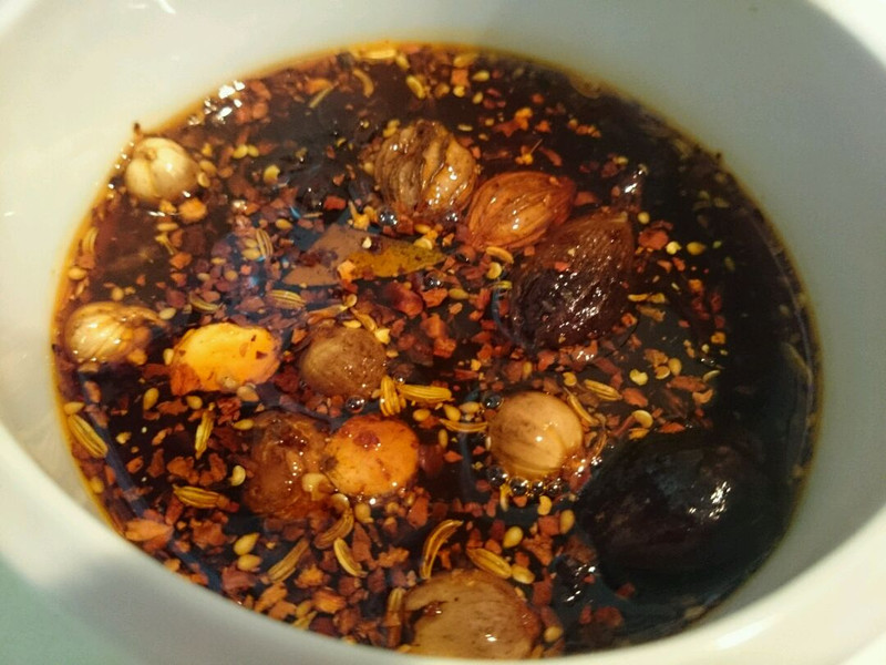以前我是香料和辣椒面混合,直接浇热油,这次尝试用油先煎香料,然后浇入辣椒面,这样香料可以被更多萃取出香味了。