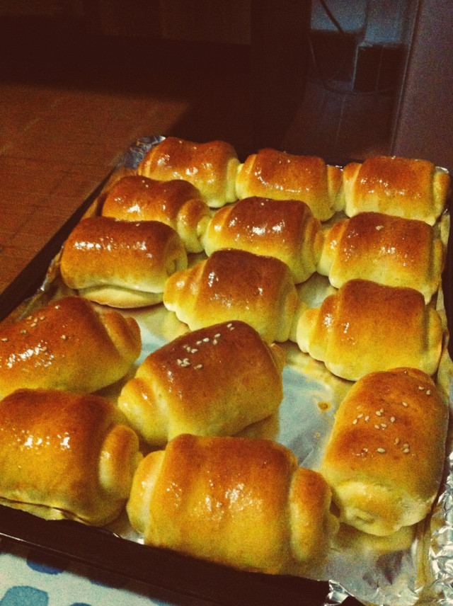 先将酵母用温水溶解,然后将除了牛油和蛋液之外的都加到面粉里混合,揉面20分钟。(忘拍照了)