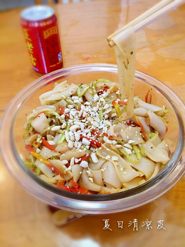 凉皮,陕西特色小吃之一。突现“筋”、“薄”、“细”、“穰”四大特色。“筋”,是说劲道,有嚼头;“薄”,是说蒸得薄;“细”,是说切得细;“穰”,是说柔软。冬天吃面皮你能保暖,夏天吃你能消暑,春天吃你能解乏,秋天吃你能去湿,真可谓是四季皆宜的、不可多得的天然绿色无公害食品。其口味主要特点是酸、辣、香、鲜。夏日,一碗调好的酸辣凉皮,再配以一碗红豆稀饭,有吃有喝,或再来盅低度酒,悠哉尤哉,那分惬意,只有盛夏品味方能获得。自己做凉皮干净卫生,吃得也放心,假日动起手来吧。