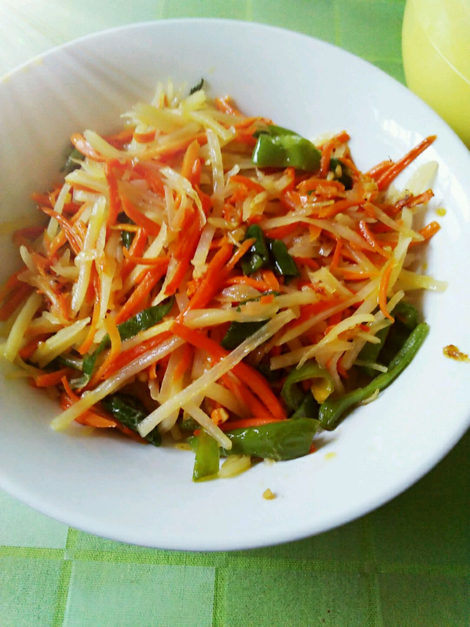 胡萝卜营养丰富,蕴含丰富的胡萝卜素,对眼睛,对视力非常好!土豆那也是极好的,有消炎作用哦!青椒丰富的维生素那更是不必说!这道素菜有个秘诀那就是碎核桃仁儿,在油里煸香,素菜瞬间会香郁很多!!营养丰富,很下饭噢 ^_^*