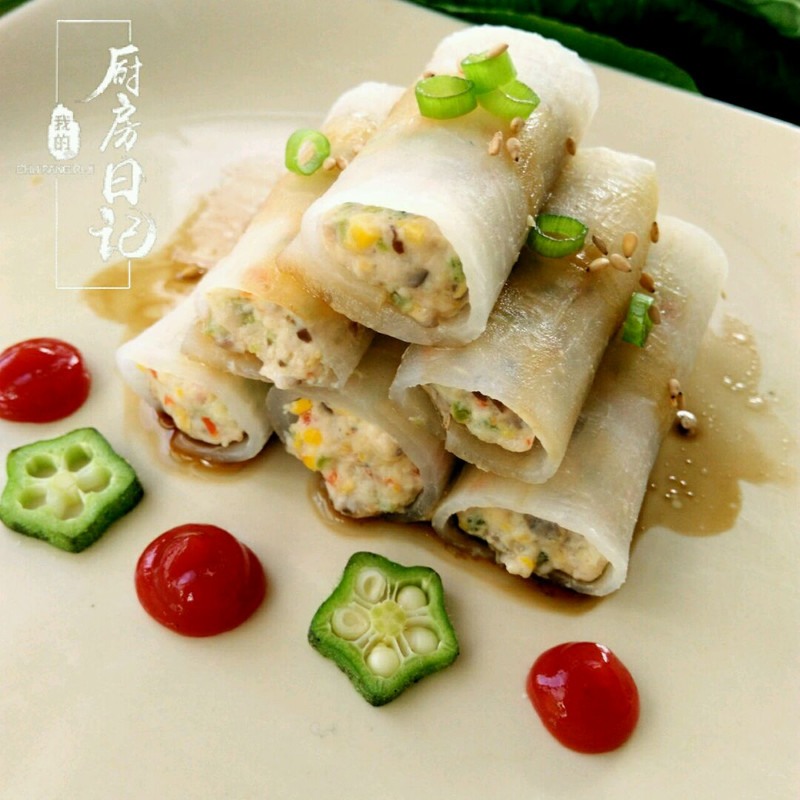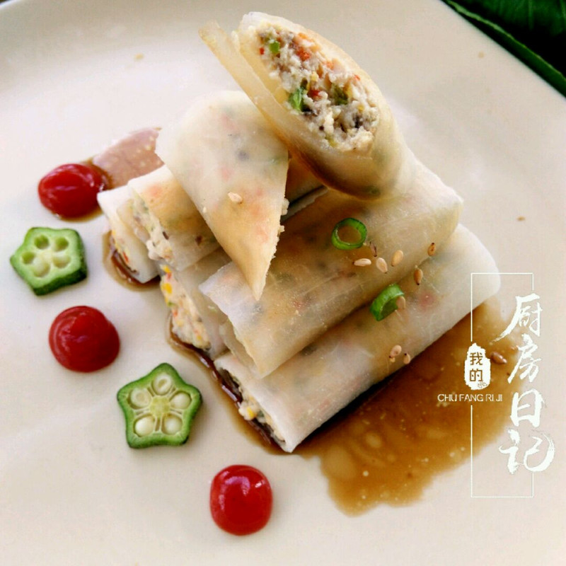 大家可以根据自己的喜好添加鸡蓉里面的配料 但是胡萝卜与胡萝卜 木耳相克 不能同食 配料尽量避开 白萝卜片在焯水后 需要放入凉水中浸泡 这样可以保持白萝卜的口感 卷馅料的时候也更加容易 加馅的时候 填充饱满 这样蒸出来后 萝卜卷更加美观 在调制内馅时候 千万不要加酱油 加了鸡蓉会变黑 只放少许盐即可 因为在蒸后 还要淋酱汁 这道菜口味是偏清淡的