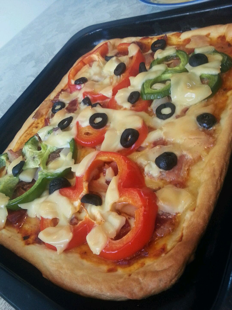 如果喜欢吃厚饼皮的兄弟姐妹们这个面饼的分量适合,若是偏爱薄饼皮的朋友这个面粉的量是可以制成两个饼皮,我就是发完后分两次吃的,两个饼皮制作完后,一个可以速冻起来,下次按照同样的步骤可以再烤一次,方便多啦“)