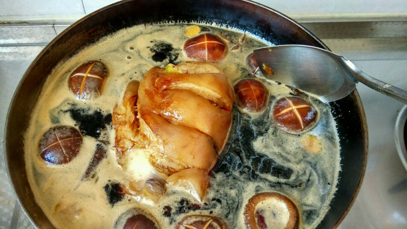 炒冰糖时一定要最小的火候,慢慢炒,变成液体时再转大火放入蹄膀滚动上色,均匀后速度放水,否则会巴锅的。。。