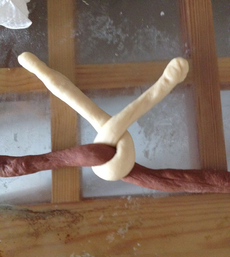 醒发后,将两种面团擀成椭圆形卷起来,醒发10分钟。