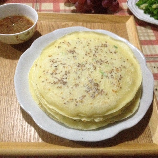 面糊不要太稠也不要太稀,太稠饼厚不好吃,太稀不好成型,全程要小火烘烤。