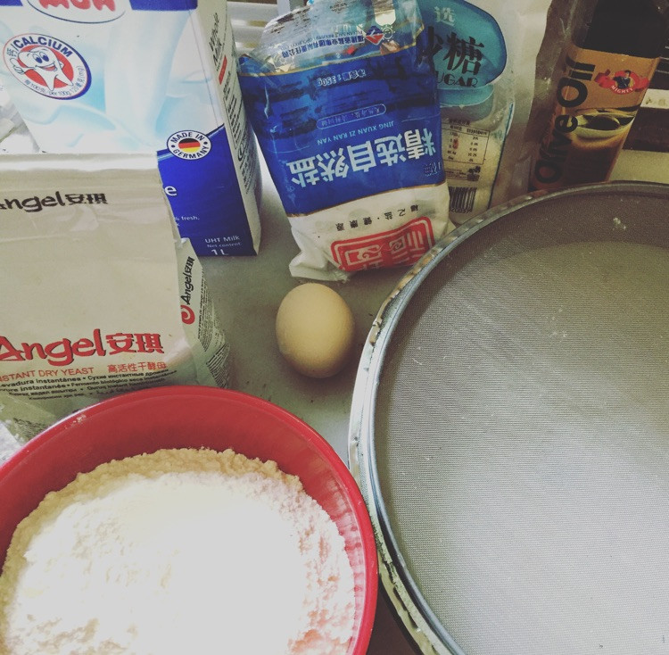 面皮用料量准确测量喔~将盐 糖 橄榄油 干酵母 牛奶 以及打散的蛋液全部加入面粉中