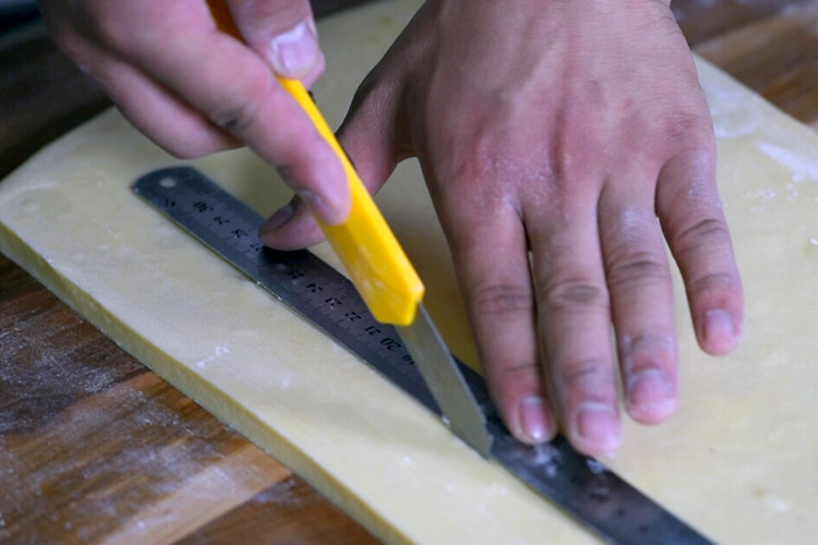 1、 为了能使做出的手撕面包纹路更加的清晰,在折面的时候需要切除多余的边角;