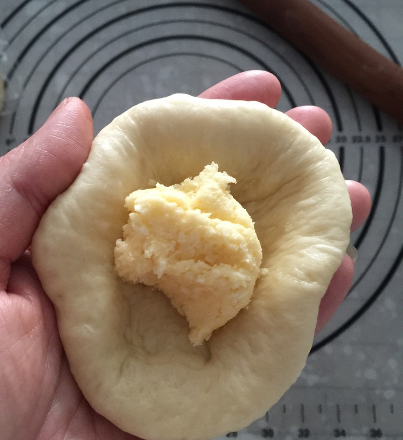 我把另外两个面团用剪子剪了十字口,在开口处填了些椰蓉馅,表面又撒些杏仁碎