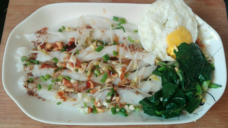 这款肠粉,我经常做,一个人的份量,方便又美味,正宗肠粉是在米浆里加蔬菜调料的,我嫌烦,参照了陕西凉皮的做法,选自己喜欢的菜和调料,另做,再拌在一起,一样好吃,各人随意。