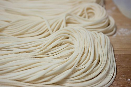 做面条的面团尽量要硬一些,刚开始和面时只要盆中没有干粉即可。等醒面半小时之后,再去揉它就会比较顺畅。