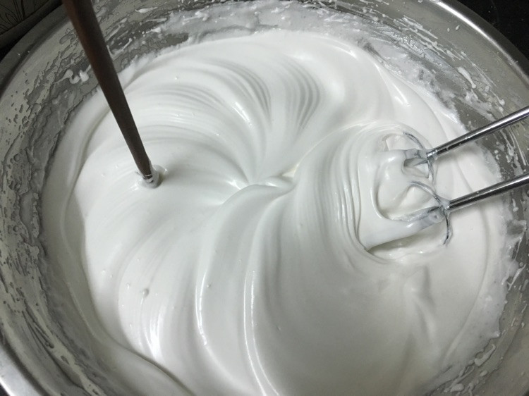 之后泡沫细腻后加入最后一份砂糖和淀粉,打发至细腻并可以把筷子立在其中不倒下
