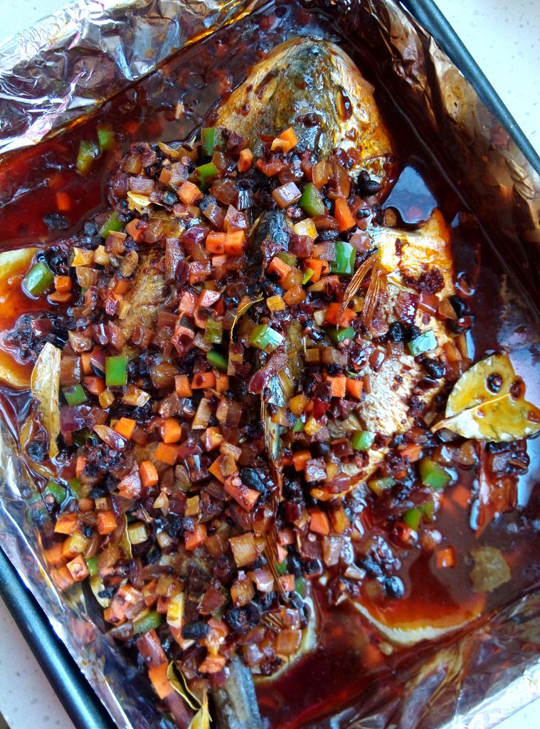 用烤箱烤出来的鱼皮酥脆,鱼肉细嫩,香辣入味。一般烤的都是鲤鱼草鱼吧,这次用了一条黄鱼,也很好吃。看起来红彤彤的很喜庆,但是辣度可以,因为胡萝卜和豆豉、红油的辣度有限,很开胃。。这一条都被我自己吃光了。。汗