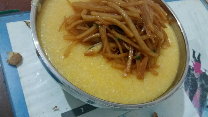 以上食材根据人数而定,我家是四个人。水开后放入玉米糁糁时候一定要边搅动边放,要不然会成了一块一块的,影响口感不说,还不容易熟。我家的玉米糁糁都是自己种的玉米打下的!有需要的可以给我留言!