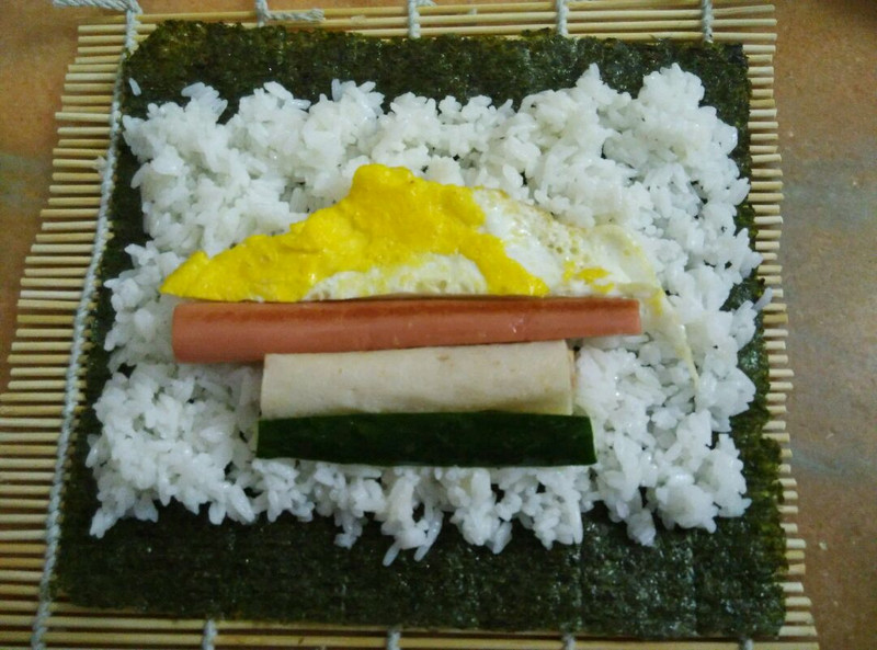 把紫菜铺在席子上,挖出拌了寿司醋的米饭,平铺在紫菜中间,紫菜要留前后一小段,再放进鸡蛋,青瓜,火腿肠和蟹棒。