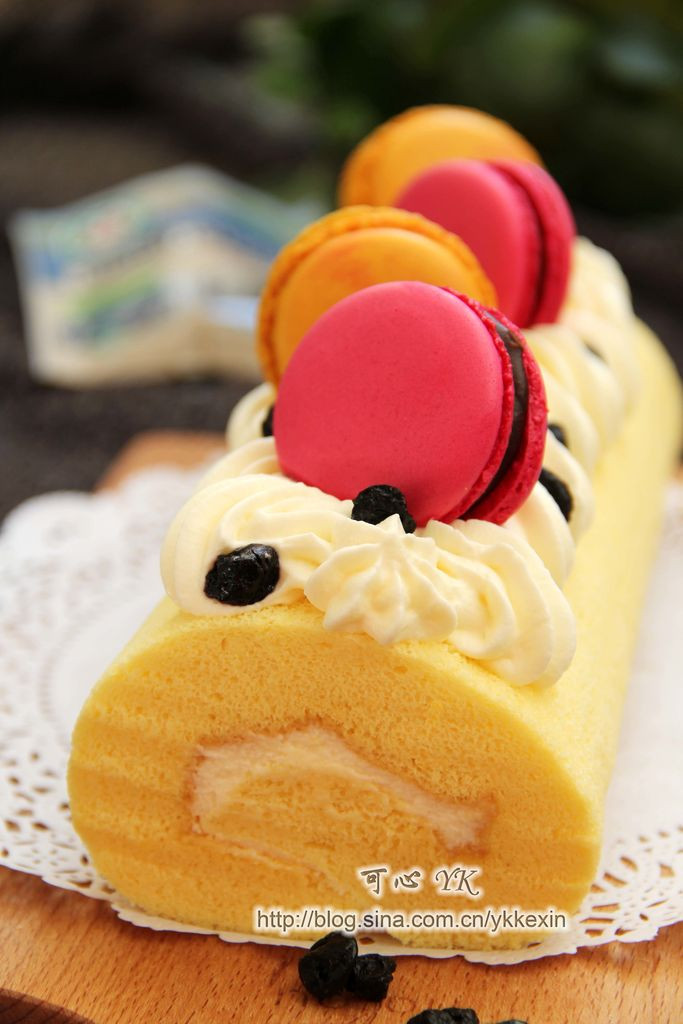 这个蛋糕卷是做给放学归来的女儿的。蛋糕体烤好后卷上奶油、装饰上昨天刚烤好的马卡龙和草莓干,绝美的组合,不仅好看,简直太好吃了。