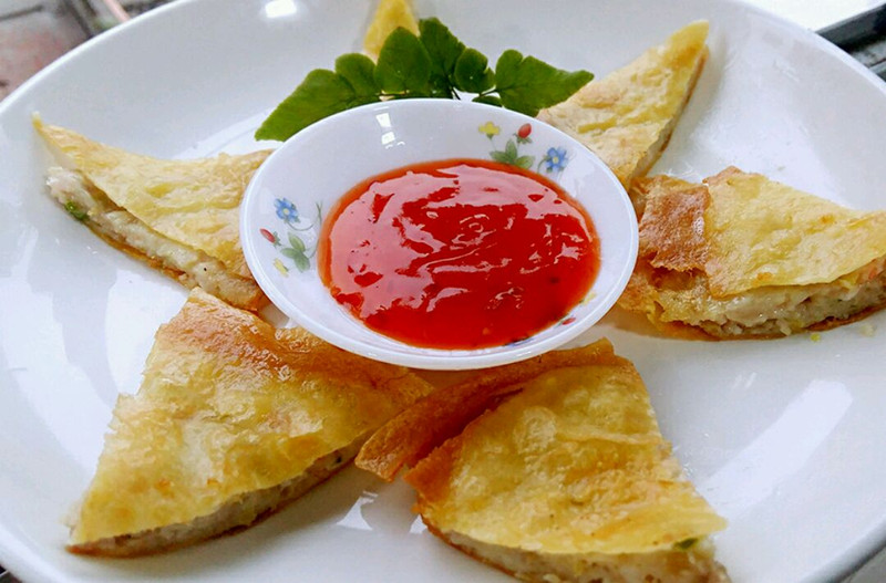 把以上食材准备好了后,就用大一点的盆来调以上的食物了,猪肉未,龙利鱼泥、虾仁泥、姜未、葱未(小葱白)、鸡蛋(只要蛋清哦)、盐调匀后在放入少许的淀粉顺着一个方向搅拌均匀后,用手反复摔打馅料(这样可以使馅料Q弹美味)。在一块蛋皮上均匀铺上适量的虾饼馅,在盖上一块蛋皮,用牙签在蛋皮上几个洞,这样饼皮就会透气,避免蛋皮和虾饼馅分离。月亮虾饼的烹饪技巧