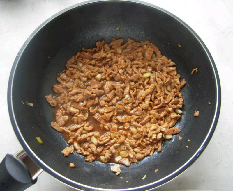 炒蒜苔的时候,不用再加油了,用炒肉剩下的底油就可以了。最好晚一点放蒜薹,炒绵了的口感不好。