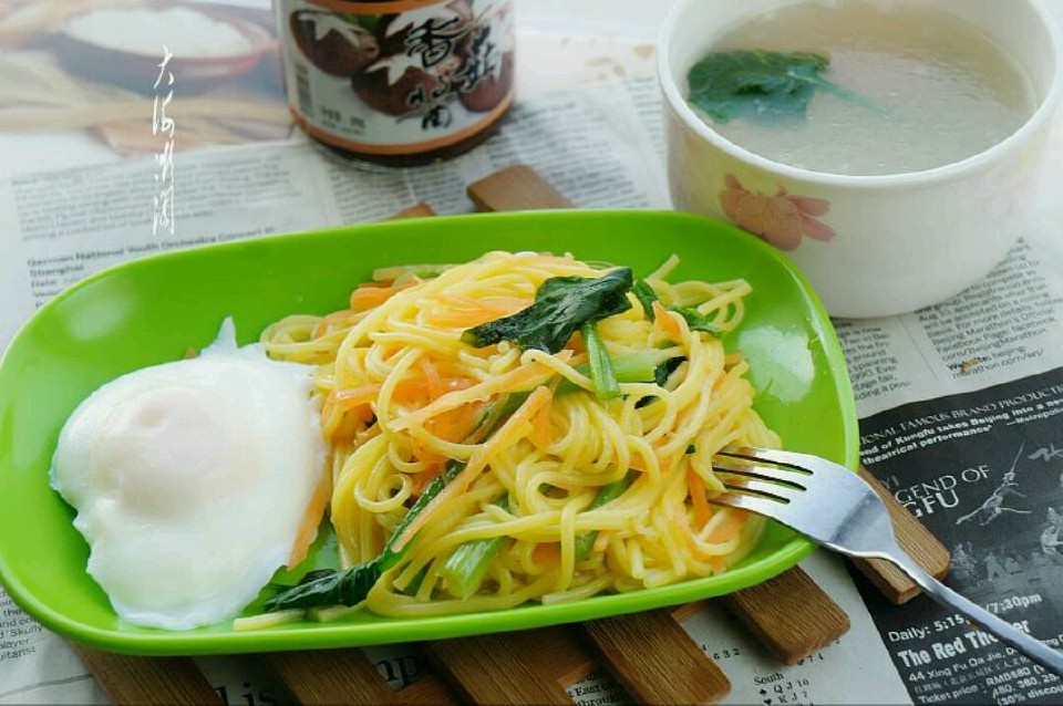 热汤玉米面条荷包蛋,快手早餐,10分钟告捷,简单有营养,一人份,一盘面、一碗汤,一个鸡蛋足矣。清淡的热汤玉米面条,好劲道,有嚼头,配上蔬菜,色彩诱人,口感很像意大利粉呐!玉米面条富含多种维生素、矿物质及微量元素,特别适合老年人健康饮食哦!