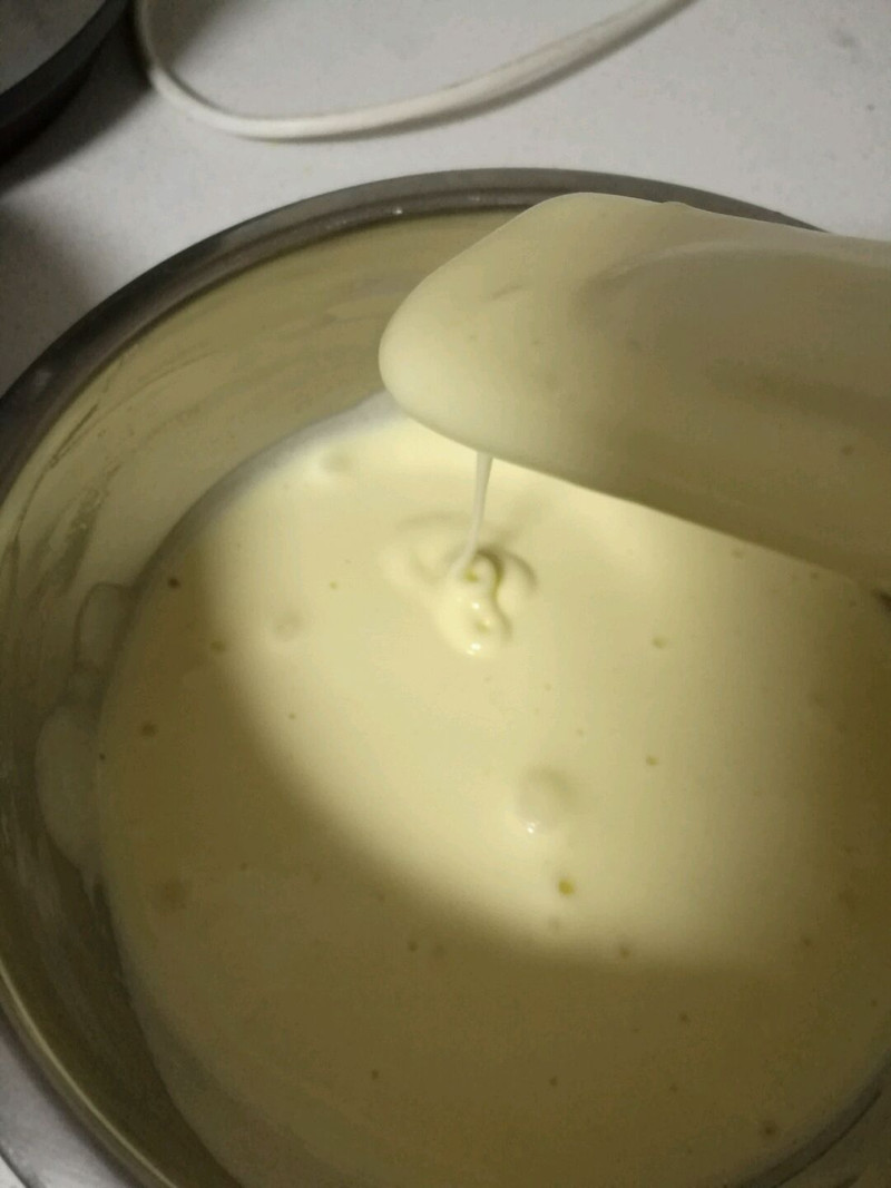将上部混合好的蛋黄糊倒入蛋白盆中用同样的方法翻拌均匀,将蛋糊倒入模具中,然后将模具轻轻从离桌面15厘米的地方摔下重复几次震出大的气泡,用牙签挑破小气泡,并且在面糊里内划几个圆圈,可以让内部的消气报销是蛋糕烤出来会更细腻。8寸戚风的烹饪技巧
