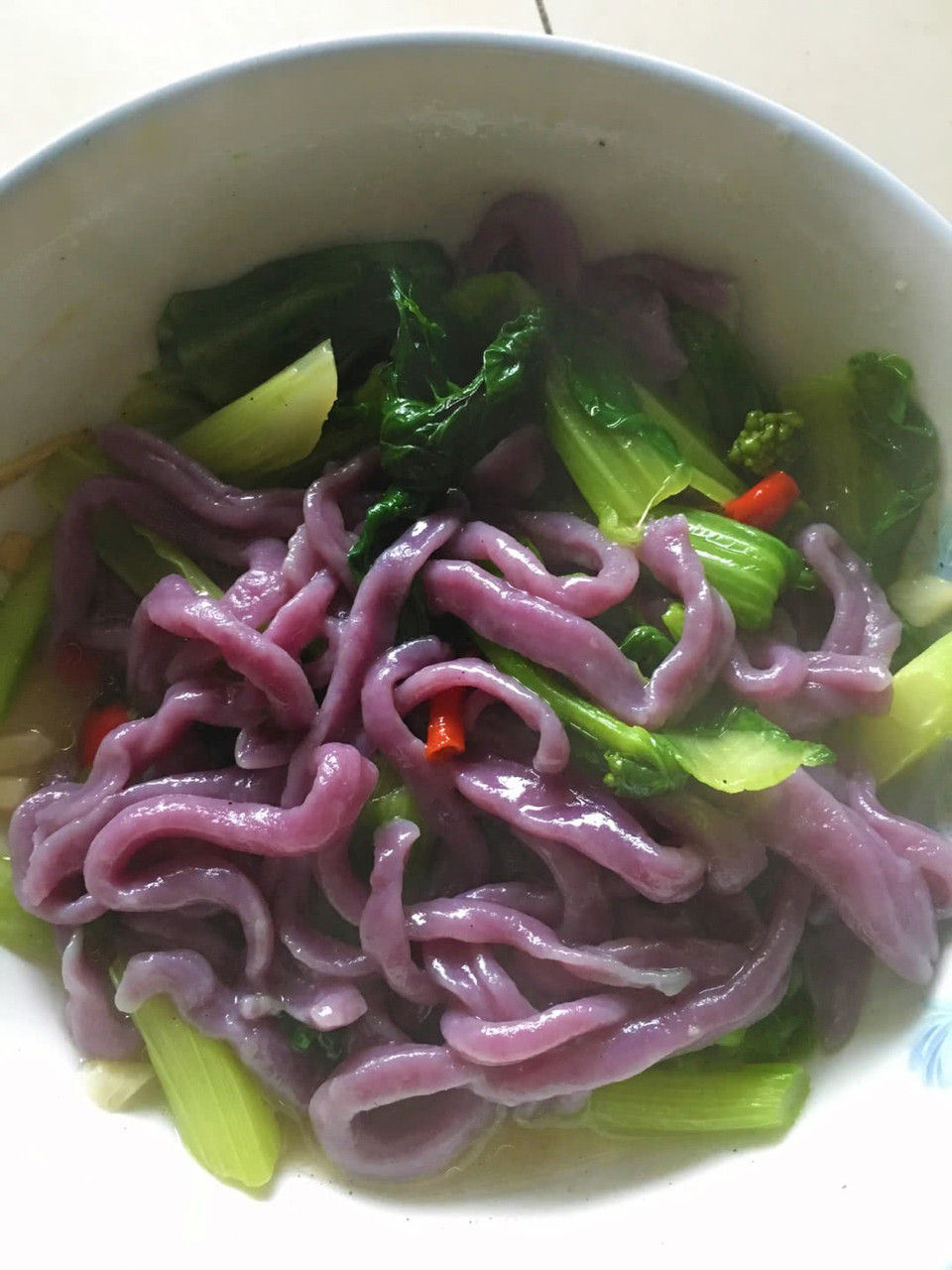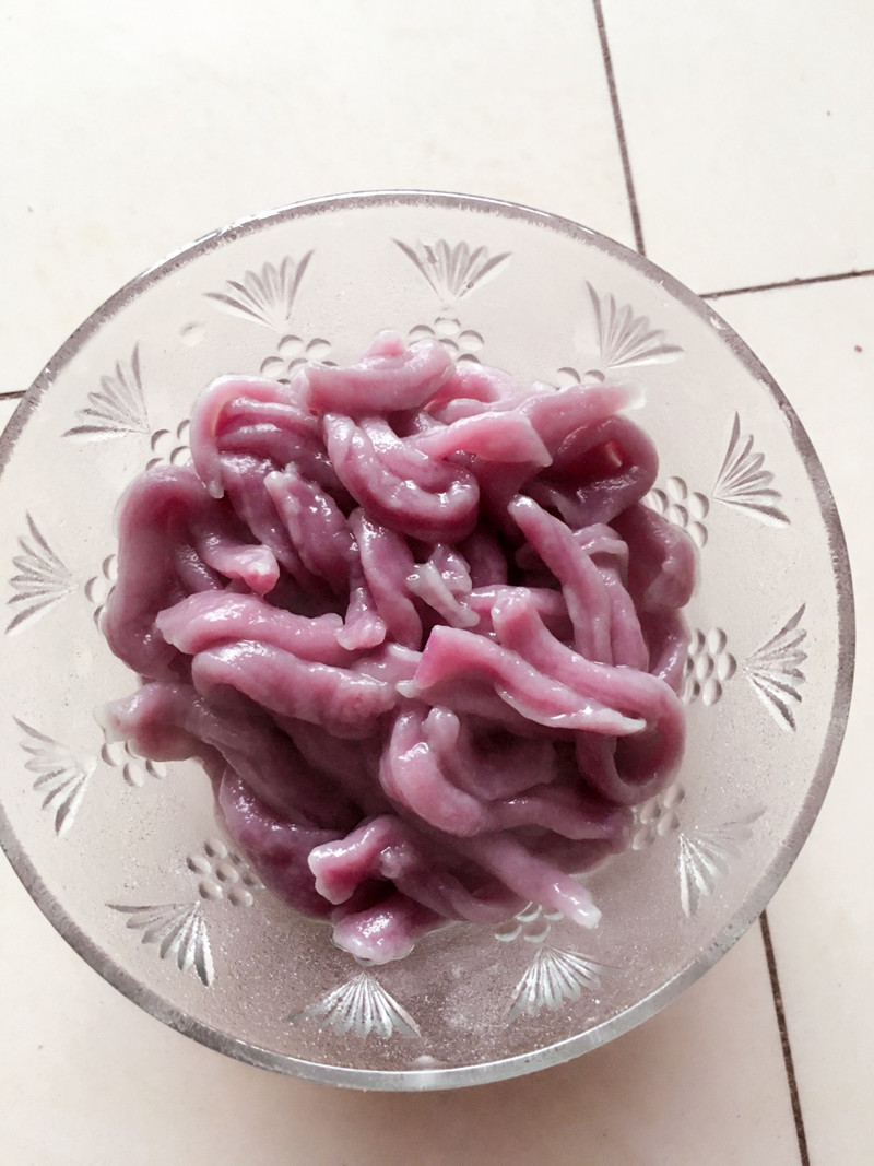 很早就想自己做面条吃了 作为一个南方姑娘却对面食特别感兴趣 很喜欢紫薯的颜色 用紫薯做过汤圆 所以就想用紫薯做做面条 没想到做出来的面条筋道又漂亮 还有些回甜呢!