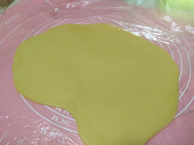 3、冷藏好的面团取出后,注意先用手揉捏均匀再擀开,否则擀开的面片表面会有不均匀分布的情况;