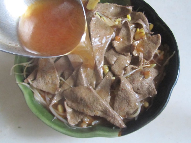 4.将准备好的花椒面、蒜末、红椒和小葱末放在猪肝表面上, 再用热油呛一下,听着嗤嗤声响,这麻辣鲜香的“水煮猪肝”就完成了。