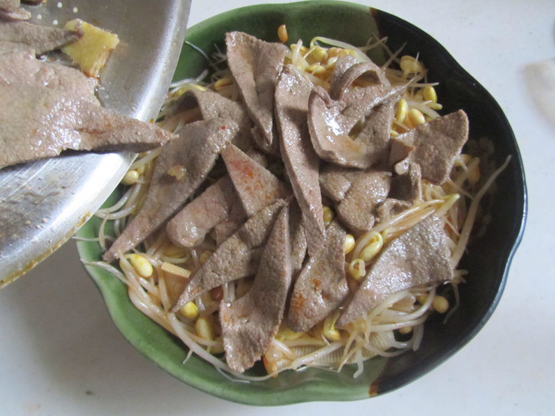 3. 将准备好垫底的蔬菜先烫煮熟铺底,再将提前腌制的猪肝一片一片放入里面烫熟,注意不要烫煮老了, 一变色后就可以捞出;